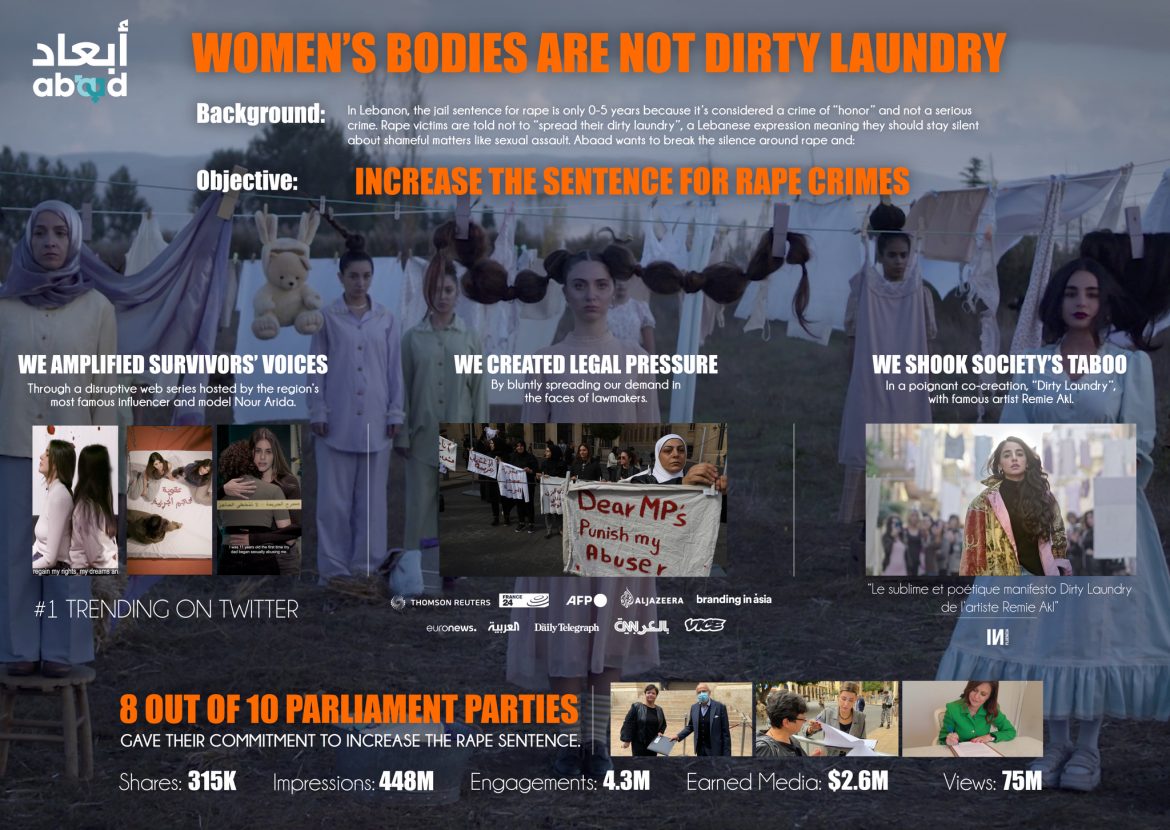 Dirty Laundry features women hanging on laundry lines by their hair and hijabs, as if they themselves were the ‘dirty laundry’, and shines a light on the need for harsher punishments for perpetrators of rape. It’s punchy, provocative and challenging, with the goal of amending Chapter Seven of the Lebanese penal code and increasing the sentence for rape. Despite its meaning stemming from an unfortunate reality faced by women in the region, the campaign resonated really well with the internal jury, who understood the campaign’s critical and well calculated elements.