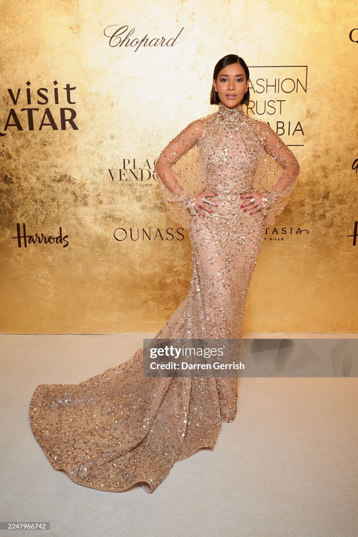Balqees Fathi wears a high-neck sheer nude tulle gown fully embroidered with tonal crystals and sequins, featuring long pleated cape sleeves from the ZUHAIR MURAD Couture Fall 2025 collection.