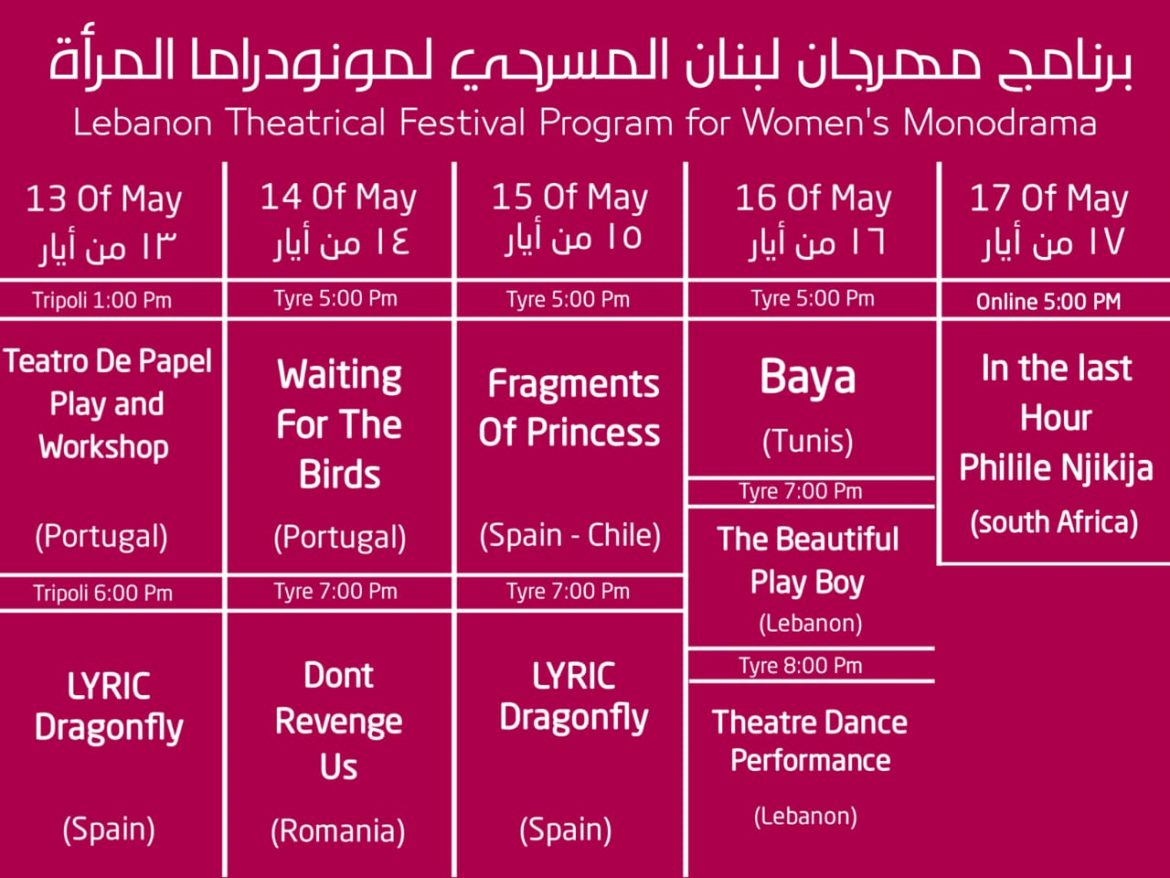 The Lebanese International Theatre Festival for Women’s Monodrama is held annually to celebrate women and their theatrical and artistic work for equality, freedom, social justice, and empowerment in society. The first edition of the festival was launched in 2019 and paid tribute to the late actress and director Siham Nasser with the participation of eight theatrical performances from Arab and foreign countries. The first Lebanese Theater Conference was held within the festival, which discussed the issue of the theater crisis in Lebanon and the importance of breaking the cultural centrality and the role of cultural centers outside the capital. The second edition was held in 2021 and the list of honors included: René Dick, Watfaa Hammadi, Fadwa Hashim, Randa Kaadi, and Bernadette Hadeeb with the participation of local, Arab and foreign theater performances that competed within the official competition for the best actress, best text, best scenography, costumes, best directing, best-integrated work, and the jury award.