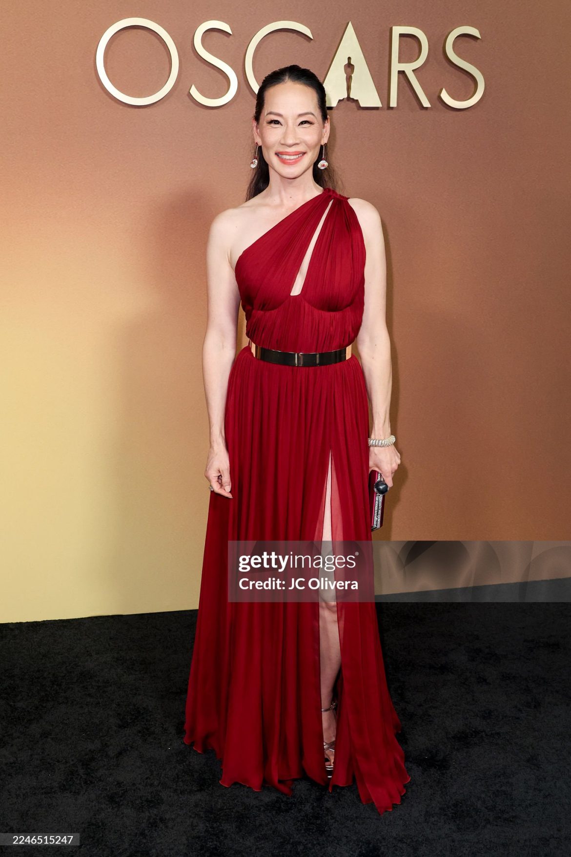 Los Angeles, CA – Actress Lucy Liu posed on the carpet wearing a red chiffon gown with an asymmetric neckline and keyhole detail from the ZUHAIR MURAD Fall 2025 Ready-To-Wear collection.