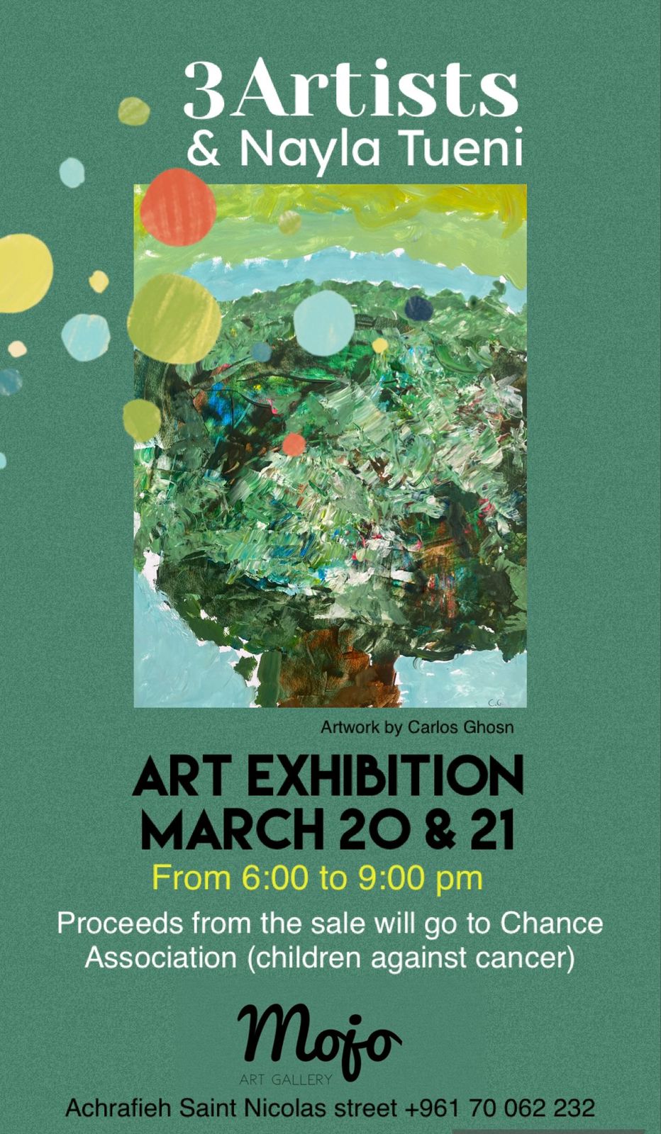 3 Artists & Nayla Tueni painted together for a month welcoming guests who created artworks as well. Artworks produced will be exhibited at Mojo Art gallery.