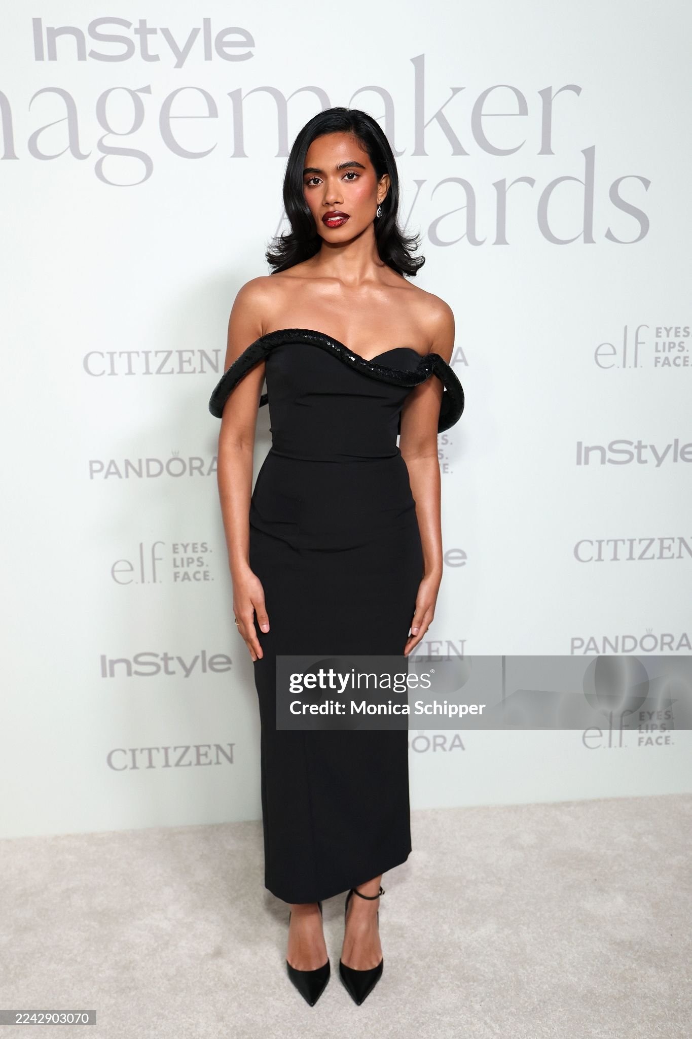 wearing a black midi dress featuring asymmetrical beaded straps