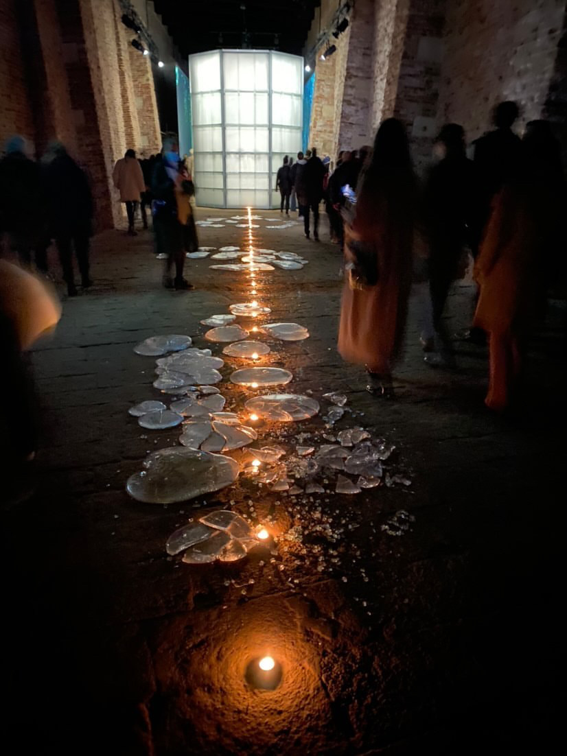 The lights of the Magazzini del Sale, the site of the Lebanese Pavilion during the six months of the Biennale, were turned off for the occasion. Dozens of candles gave off their orange glow in the space. They were laid out on the ground along the trail of glass, a fractal metamorphosis materializing both the impact of the explosion of the 4 August 2020 in the city of Beirut, the traces of tree hollows, and the antiforms. The guests were invited in a slow procession to walk towards the architectural piece housing Etel’s artwork, a circular and octagonal building of glass and light, with a semi-spherical roof.