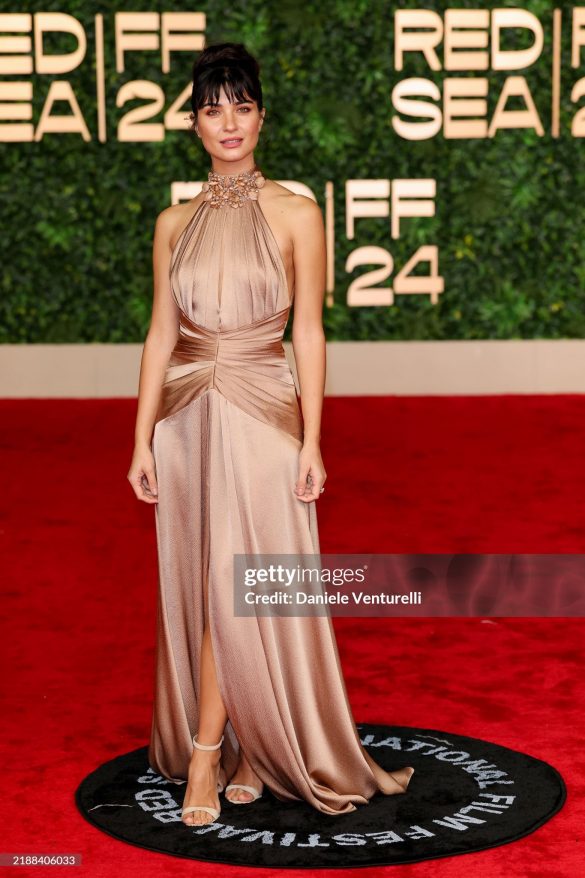 Tuba Buyukustun wears a metallic champagne halter dress featuring intricate seashell embroidery around the high neckline and refined draped detailing at the bodice from the ZUHAIR MURAD Ready-To-Wear Spring 2025 collection to the 2024 Red Sea Film Festival.