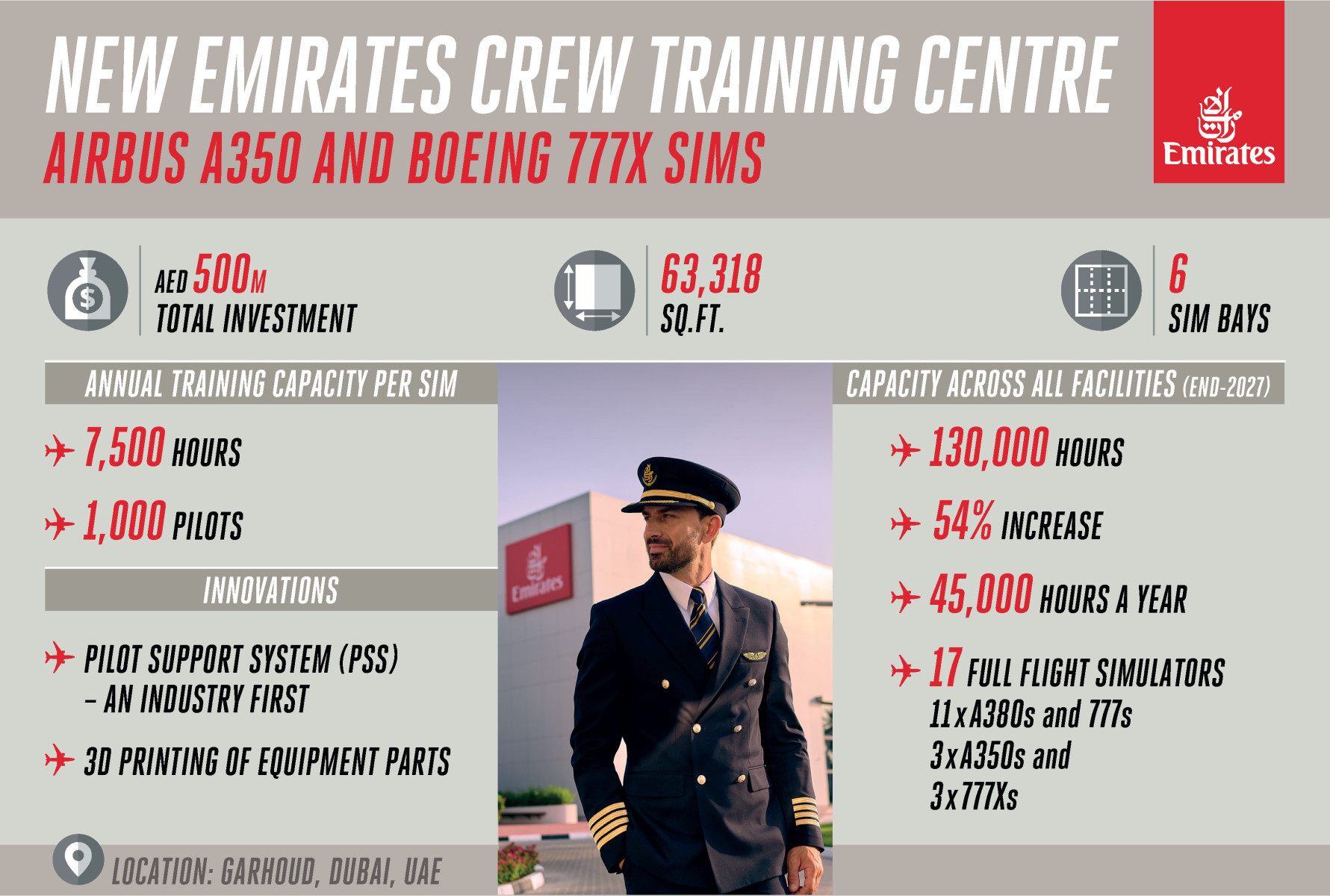 Expands Emirates’ yearly pilot training capacity by 54% and 45,000 hours– Designed and built with an investment of US$135 million