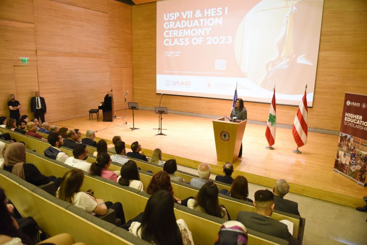 Beirut, May 25, 2023: The Higher Education Scholarships Program (HES), funded by the United States Agency for International Development (USAID), at the American University of Beirut (AUB) held its graduation ceremony for 91 scholars. The event was an opportunity for the U.S. government and AUB to celebrate a decade of partnership in education through USAID’s HES program. U.S. Ambassador Dorothy Shea, USAID Acting Mission Director Walter Doetsch, AUB President Fadlo Khuri, AUB faculty and staff, and the scholars attended the ceremony.