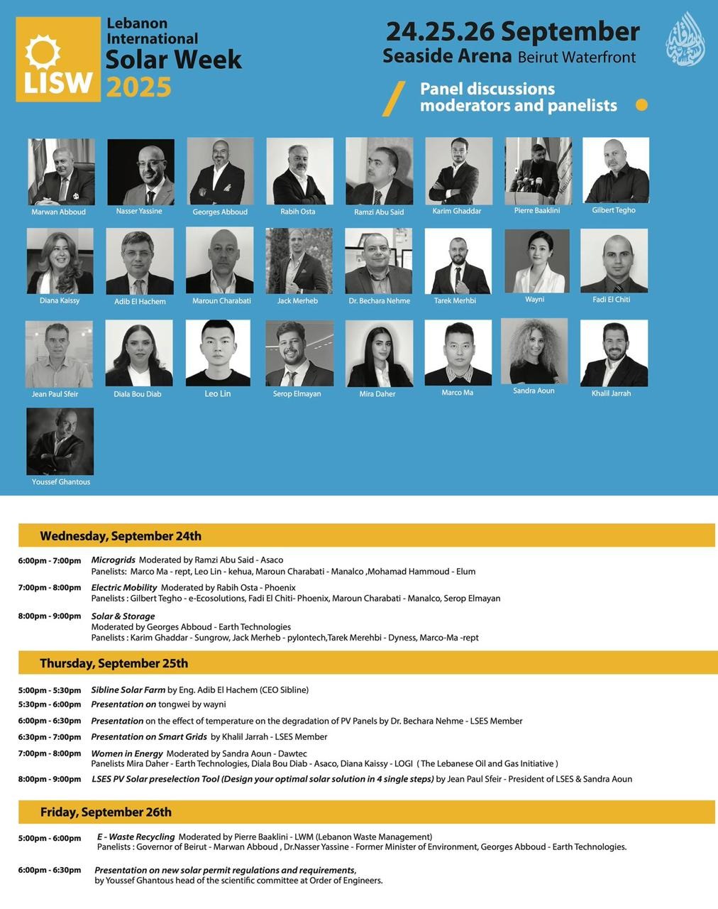 Under the patronage of H.E. Minister of Energy and Water Joe Saddi, and in the presence of H.E. Minister of Industry Joe Issa El-Khoury, the Lebanon International Solar Week 2025 (LISW 2025) was officially inaugurated yesterday at the Seaside Arena – Beirut Waterfront. The event continues until tomorrow, September 26.