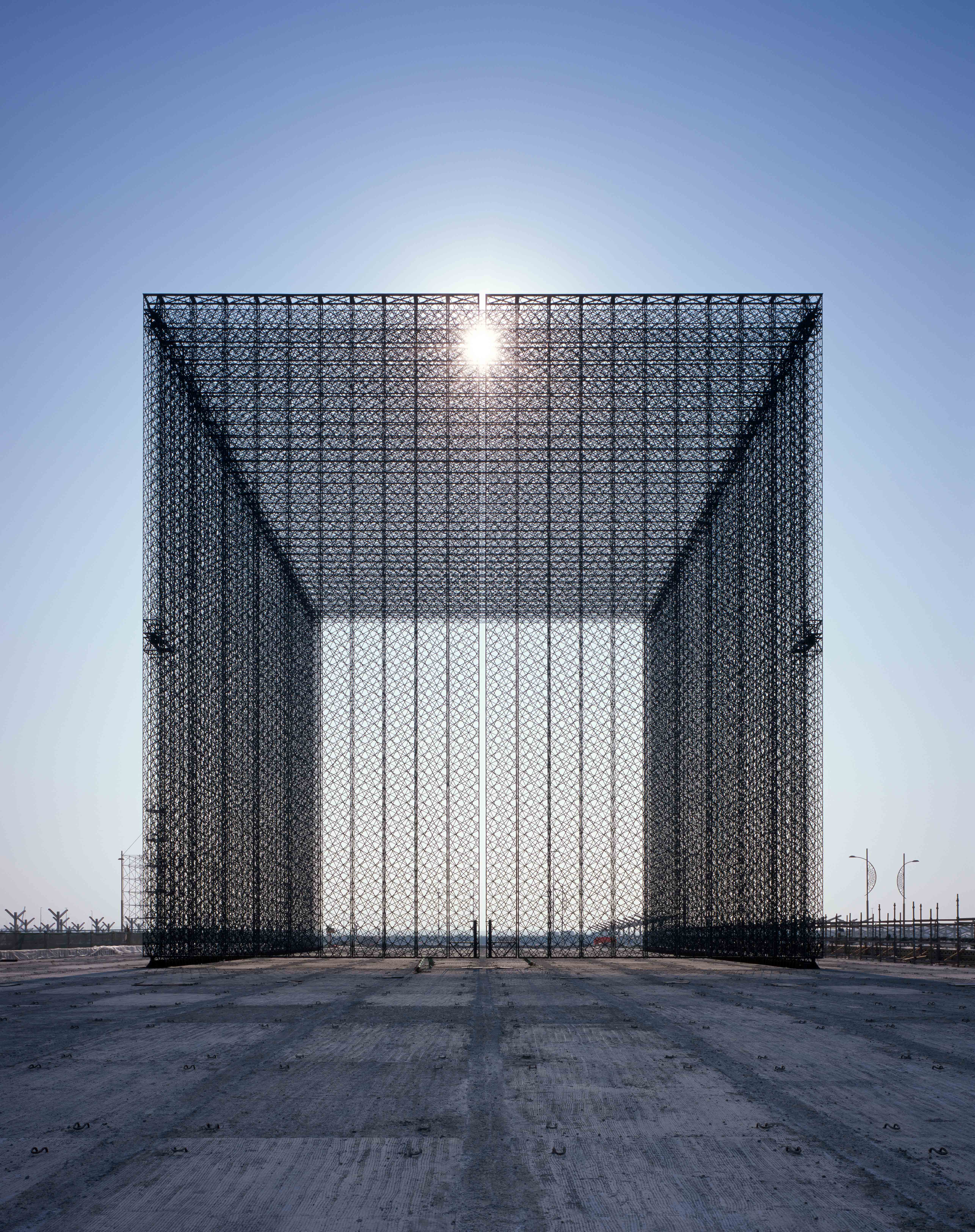 Each portal features two vast doors, 21 metres high and 10.5 metres wide, that will be opened every morning of the 173 days of Expo 2020 in a symbolic act of welcoming the world. The portals lead to tree-filled arrival courtyards, also designed in collaboration with Khan – one in each of the three Expo 2020 districts: Opportunity, Mobility and Sustainability.