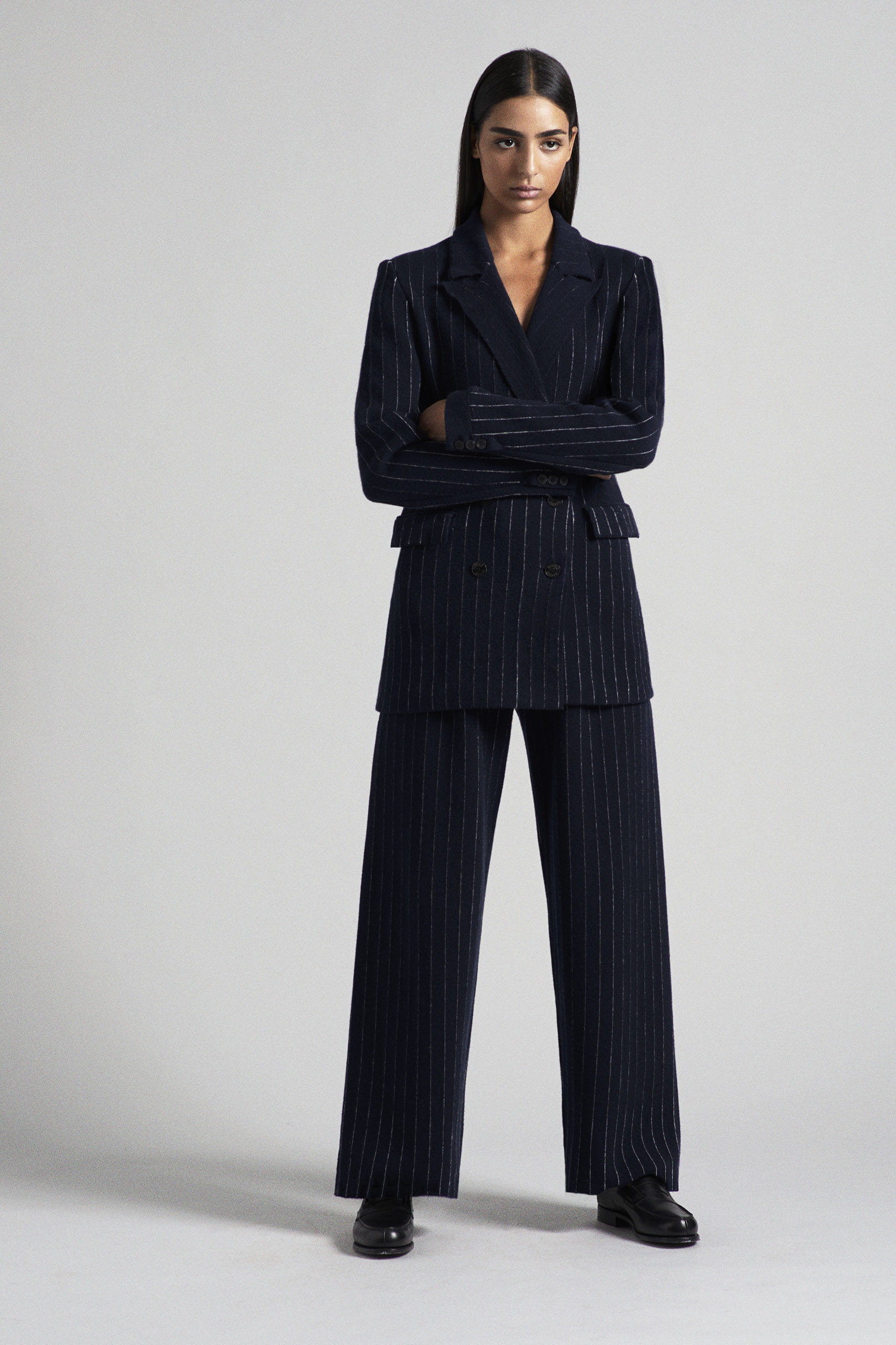 The Fall-Winter 2020/21 collection continues to develop themes that have been explored in previous collections, such as “English college” and “sportswear”. It also introduces new unisex pieces: a fluid pair of jogging pants and a jumper with a Milano stitch that exude the look of a luxury jersey ensemble that both is both comfortable and elegant. Certain pullovers are emblazoned with a large B letter on the chest in bouclé cashmere, in the spirit of student uniforms. What began as a line of cashmere denim, which now includes boyfriend pants and new colours, the trompe-l’oeil range continues to expand. Among the new pieces are a coat with a shearling effect and a pin-striped suit constructed with absolute respect for tailoring.