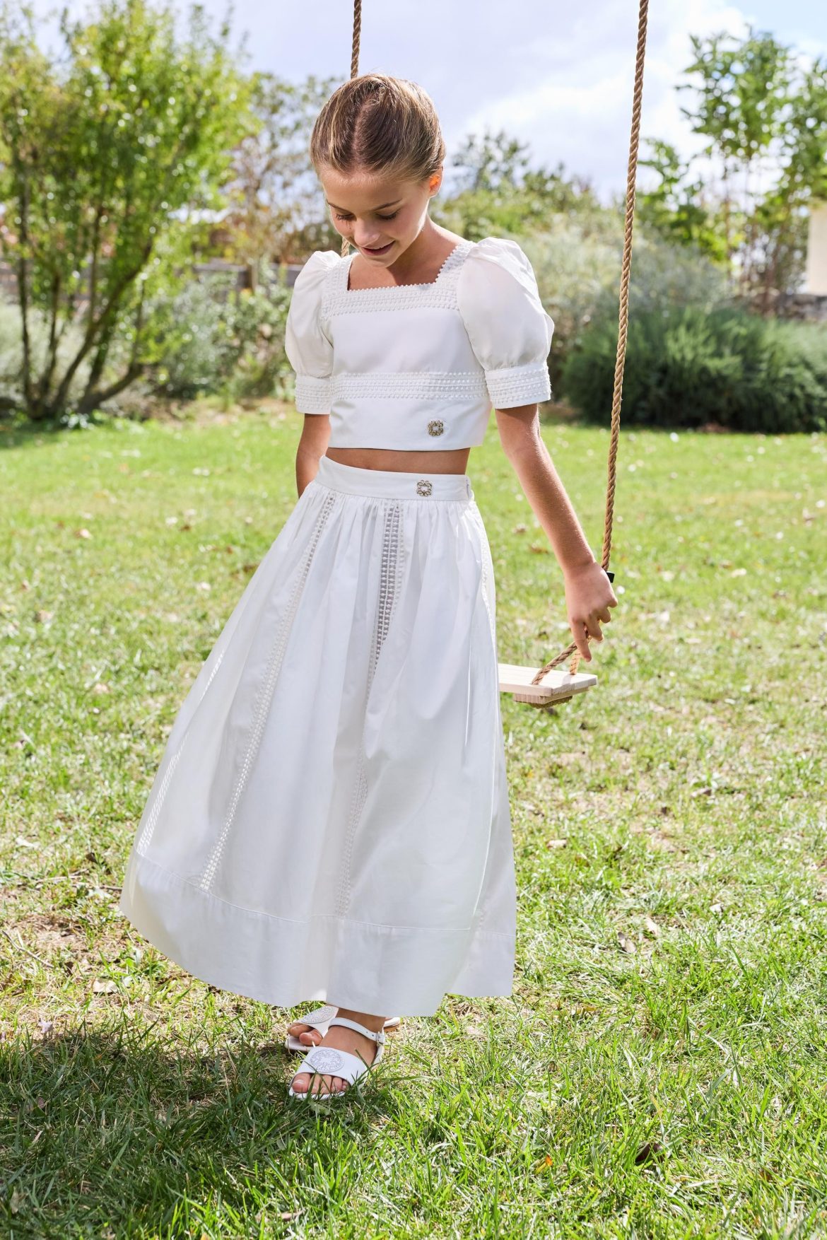 Softly structured dresses, embroidered organza skirts, and airy cotton pieces echo the rhythm of nature — light, organic, and full of movement.