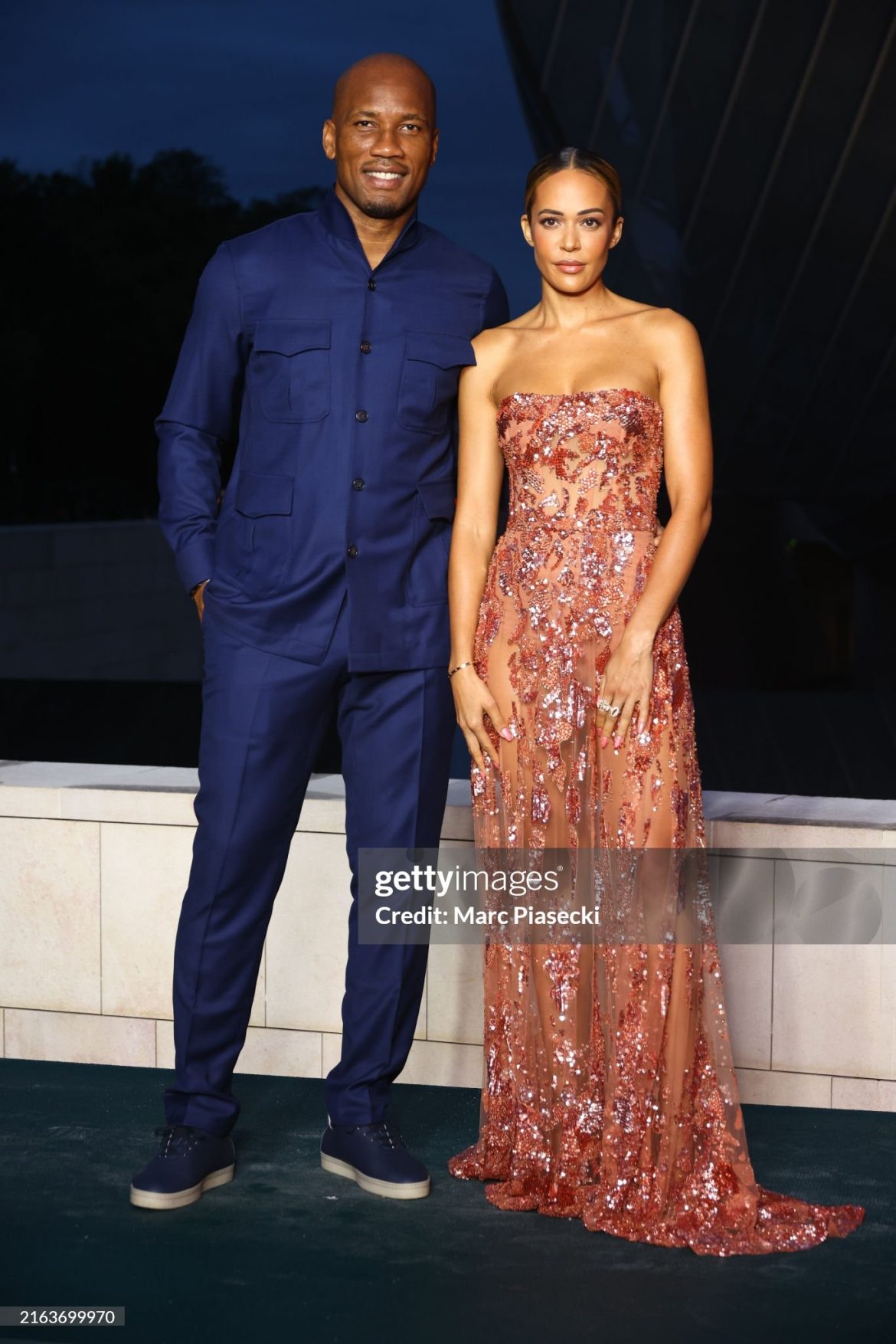 Gabrielle Lemaire, alongside her partner Didier Drogba, wears a sheer terra cotta tube dress embroidered throughout from the ZUHAIR MURAD Ready-to-Wear Resort 2025 collection to The Prelude to the Paris Games 2024.