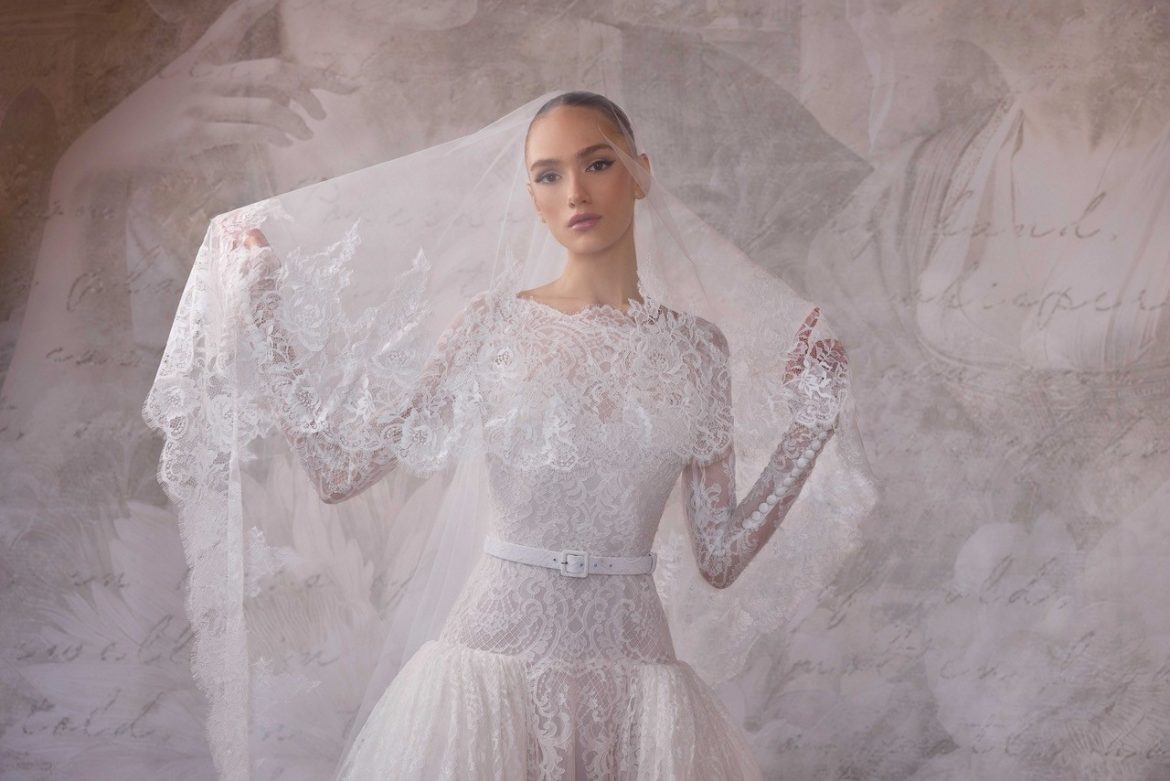 The gowns speak in quiet, romantic codes: floral lace leads; pearls softly glow. Silhouettes skim the body, then unfold with ease. Low waistlines to lengthen, Basque waistlines to sculpt. Veils are light, Chantilly or mantilla, adorned with blossoming lace and constellation of pearls. Skirts float from airy A-lines to gentle ball shapes over blush tulle. The palette stays porcelain white, soft ivory, and veil-pink so lace and pearls take focus. Each gown is a keepsake; defined by floral lace, luminous detail, and the hush of pearls.