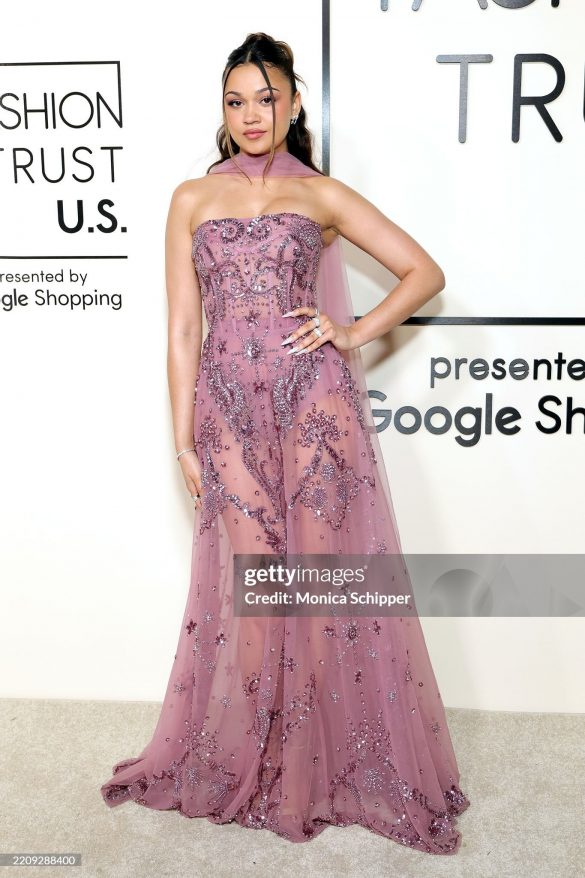 Actress Madison Bailey looked beautiful wearing a blush lilac chiffon gown with silver beaded embellishments, paired with a sheer scarf from the ZUHAIR MURAD Ready-To-Wear Spring 2025 Collection.