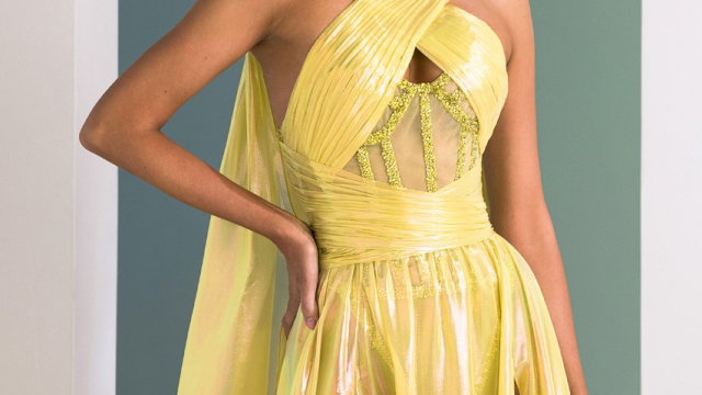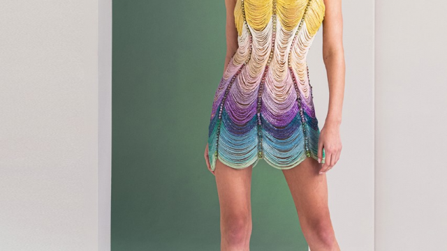 The collection features 40 dresses made from holographic materials that flaunt strong bold colors. Through lively pulsations and contrasting rhythms, Rami Kadi affirms the energy and strength of color. The dresses of Rami Kadi’s Lucid Algorithms collection appear to flirt with the light around them. The holographic materials absorb pigmentation and reinterpret the colors of light, leaving us with a shimmering effect.