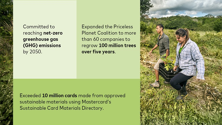 - Exceeded 10 million cards made from approved sustainable materials using Mastercard’s Sustainable Card Materials Directory.