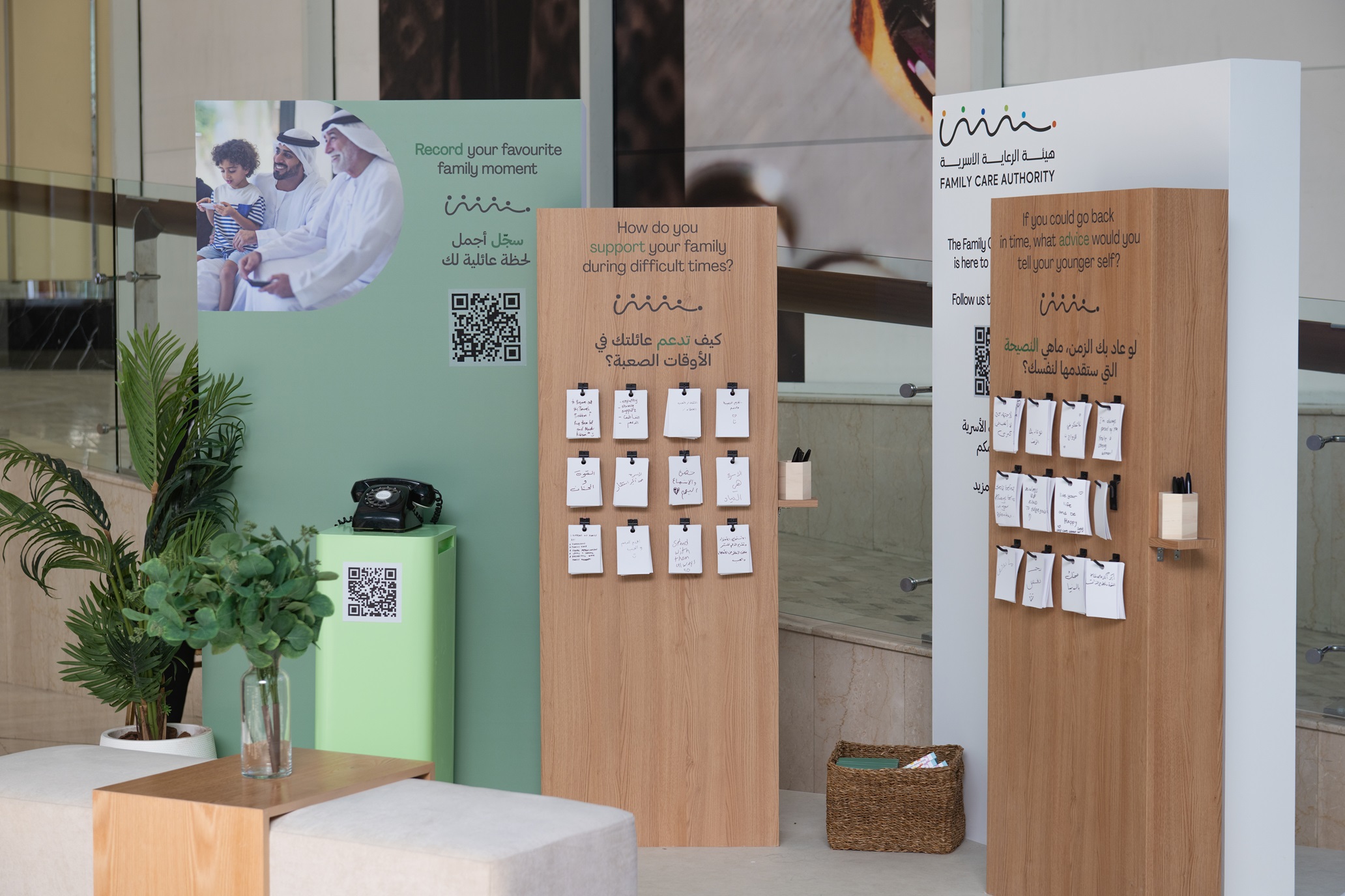 Her Excellency Salama Al Ameemi, Director General of the Family Care Authority, took part in the community activations, designed to encourage participation and reflection. The activations were hosted at key community hubs, including Nabdh in Al Falah, Al Ain Mall and Al Dhafra Mall. Each location featured two engaging experiences. The “Wall of Wisdom” offered a space for community members to contribute handwritten notes filled with advice, reflections, and meaningful messages on family life. Alongside it, the “Dial in a Story” experience invited visitors to record personal voice messages sharing their most cherished family memories, celebrating the stories that shape and connect generations.