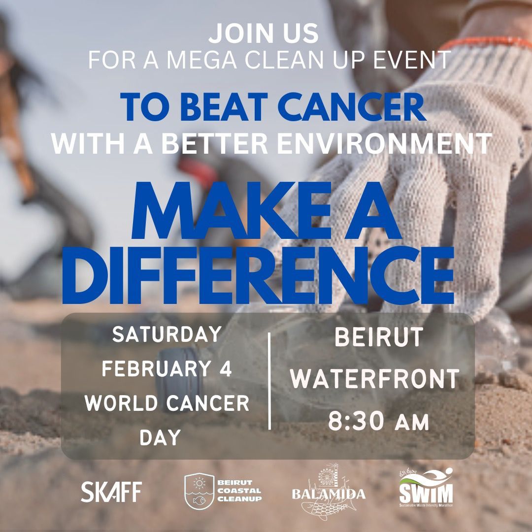 Let’s MAKE A DIFFERENCE! Let’s recognize the Power of Working Together!!! Large or Small, each one of us can make a great impact to raise awareness about the importance of keeping a pollution free environment to reduce cancer and other diseases caused by Air, Water and Food contamination. JOIN us on Saturday, On February 4, World Cancer Day For a MEGA CLEAN UP At Beirut Waterfront At 8:30 am TAKE ACTION Get involved in any way YOU CAN And MAKE a social change. TAP ON THE LINK BELOW TO REGISTER: https://chat.whatsapp.com/ElrQHQTbr9eDK8gZgVRszz