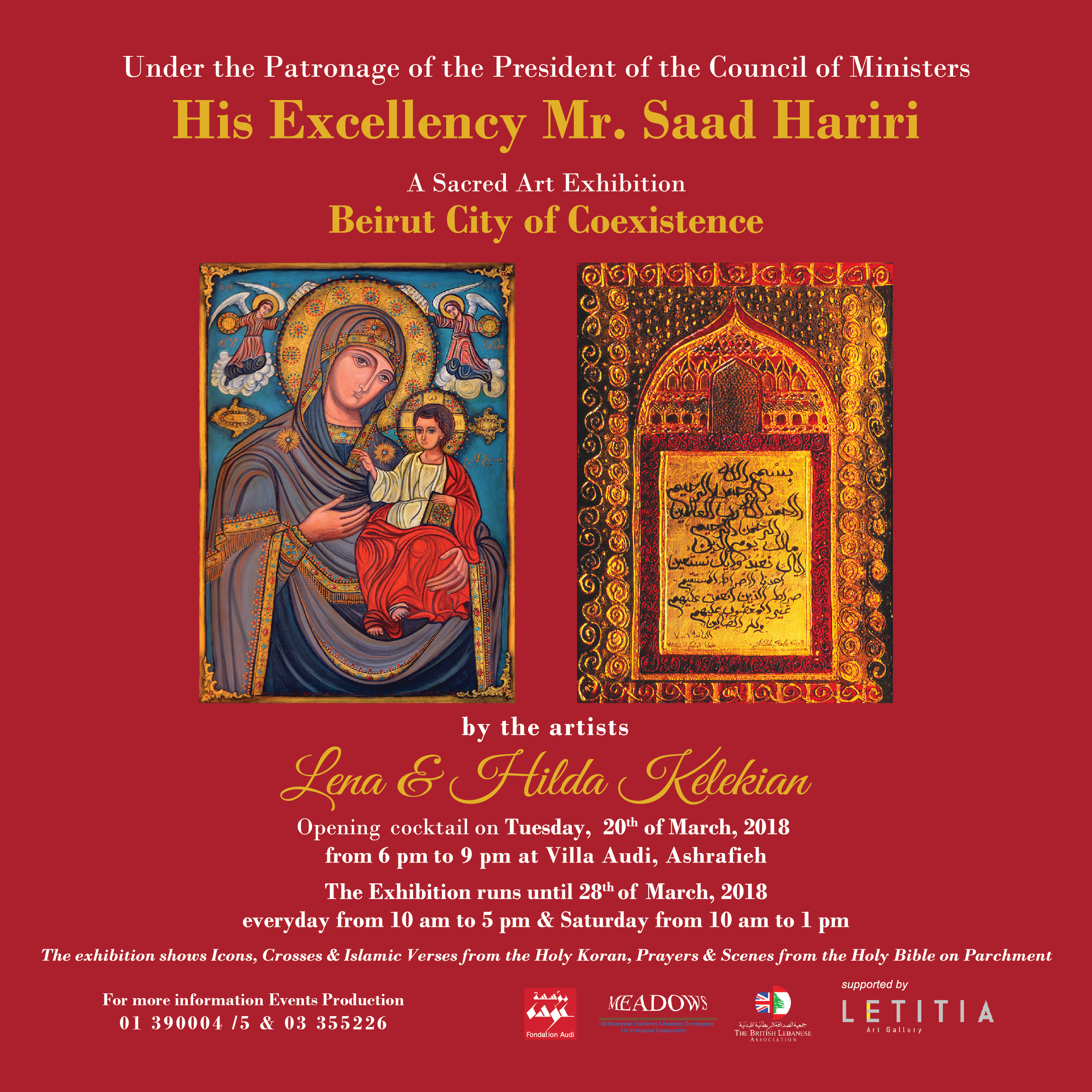 Beirut, 12 March 2018 – Under the high patronage of the President of the Council of Ministers, H.E. Mr. Saad Hariri, renowned artists Lena and Hilda Kelekian will inaugurate a sacred art exhibition on March 20th 2018 at Villa Audi, in Ashrafieh.