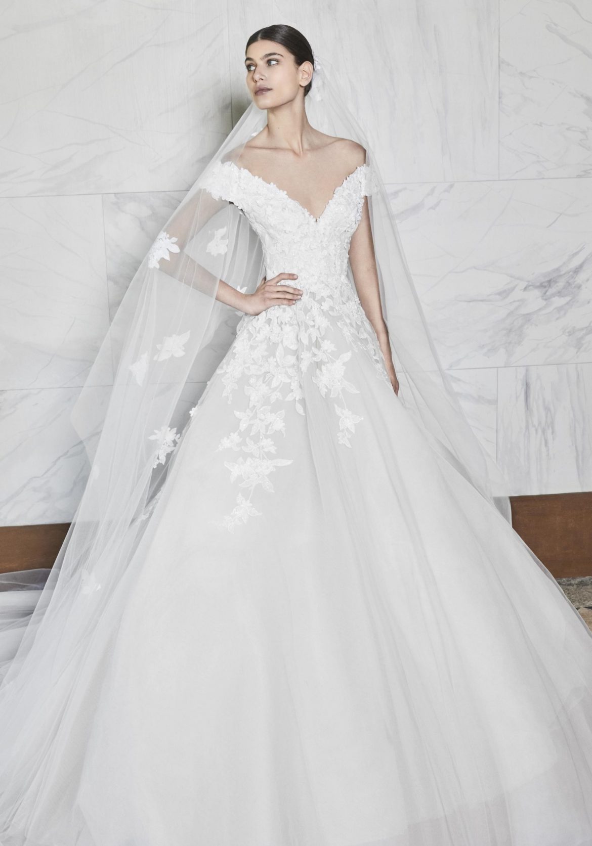 Art Déco inspired, each gown is exquisitely composed with precise intention and material artistry. Fine filigree beadwork tresses across ballet and strapless necklines into linear symmetrical abstractions that cascade down demure tulle skirts in glistening sunrays. Sumptuous draped mikado wraps the female form as pure satin ties into a sweetheart bow, bringing a hint of capricious movement to pristine structural lines. Iridescent crystals and sequins delicately illuminate floral appliqué and hemlines, like gemstones catching flickers of light. Delicate floral outlines of Chantilly lace dance off shoulders and down lustrous sleeves, only to soften into ballgowns of voluminous proportion.