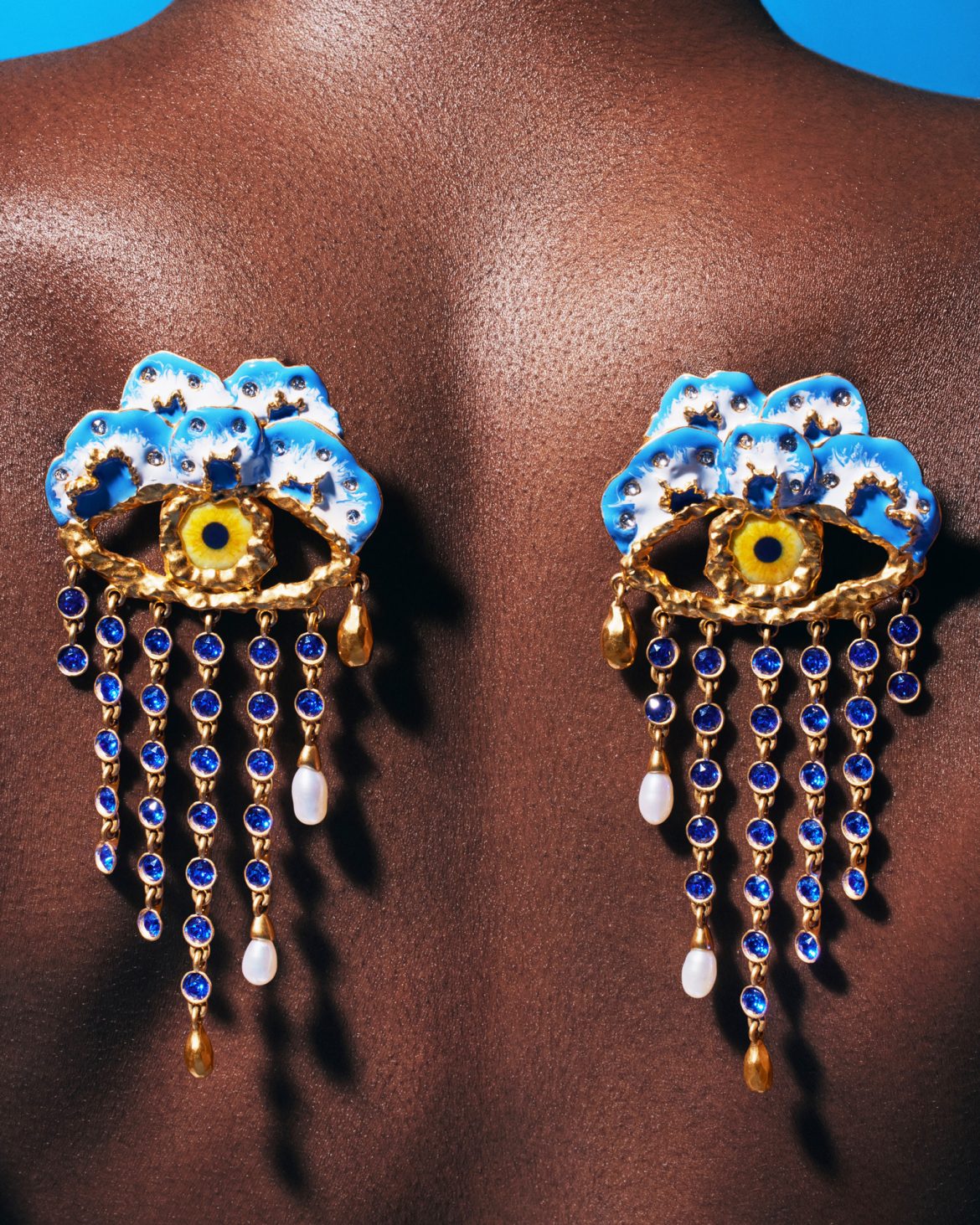 For its Summer 2023 collection, Schiaparelli combines its signature surrealist anatomical codes with colorful flowers, in subtle, refined jewelry made of hammered goldplated brass and enamel.